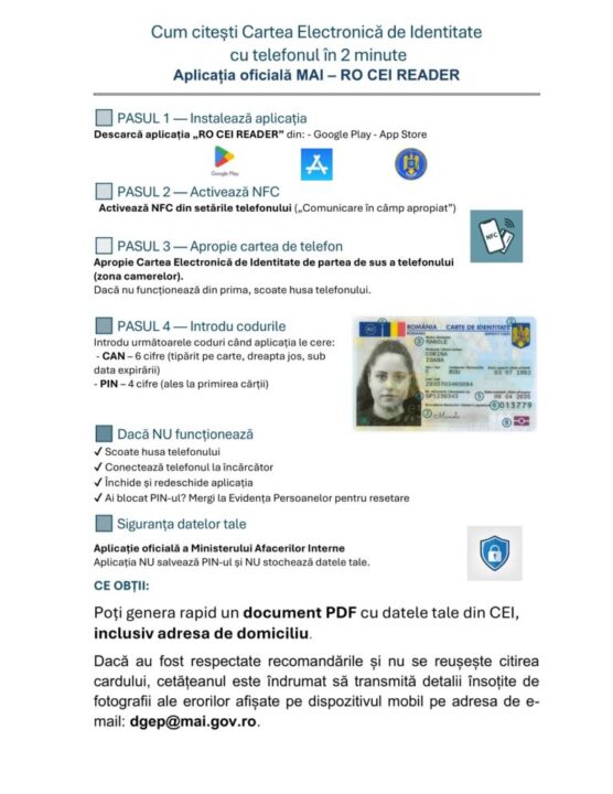 Începând cu data de 27.09.2025 Ministerul Afacerilor Interne a pus în circulație/în funcțiune aplicația pentru mobil RO CEI READER în platformele Android și IOS.